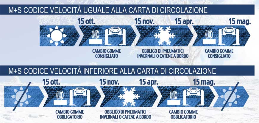 Se lo pneumatico invernale M+S ha un indice di velocità uguale o migliore a quello indicato dalla carta di circolazione può circolare anche d’estate. Al contrario, se ha un indice di velocità inferiore deve essere cambiato.